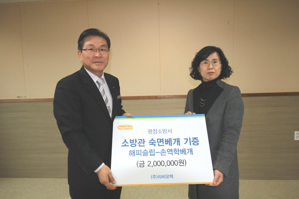◇ ㈜라비오텍은 야간출동 등으로 취침에 어려움이 있는 평창소방서(서장 김남숙) 소방관들을 위해 숙면베개(200만원 상당)를 기증했다.