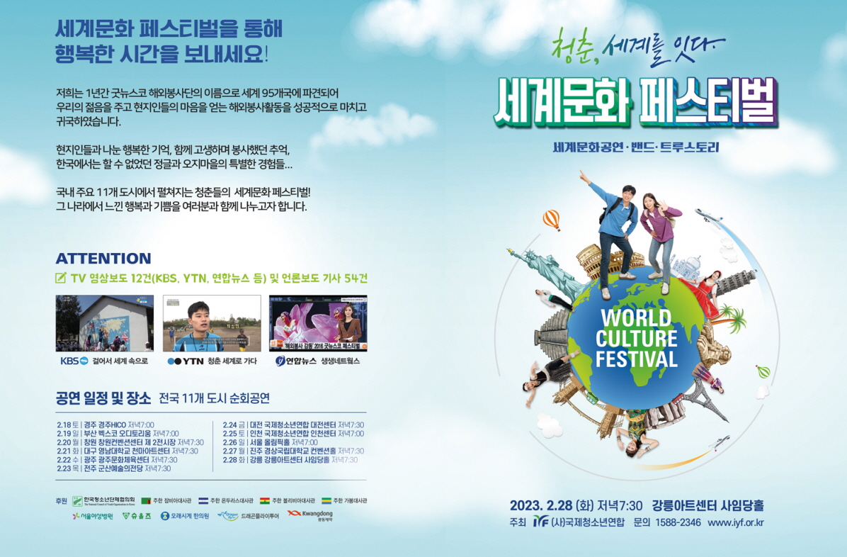 젊은 대학생들이 지구촌 곳곳에서 경험한 색다른 문화와 솔직하고 젊음이 빛나는 자신들의 이야기로 굿뉴스 밴드, 라이쳐스 스타즈, 세계 각국 문화 댄스, 리얼 스토리+뮤지컬등 여러 공연으로 풀어내는 문화 대축제!