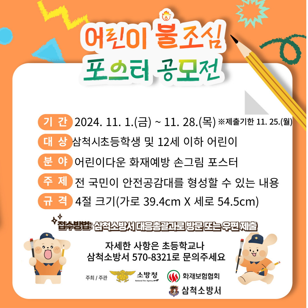 | 895 | 삼척소방서, 2024년 어린이 불조심 손그림 포스터 공모전 개최 | 삼척홍보 | 2024-11-01 | 1288 | |