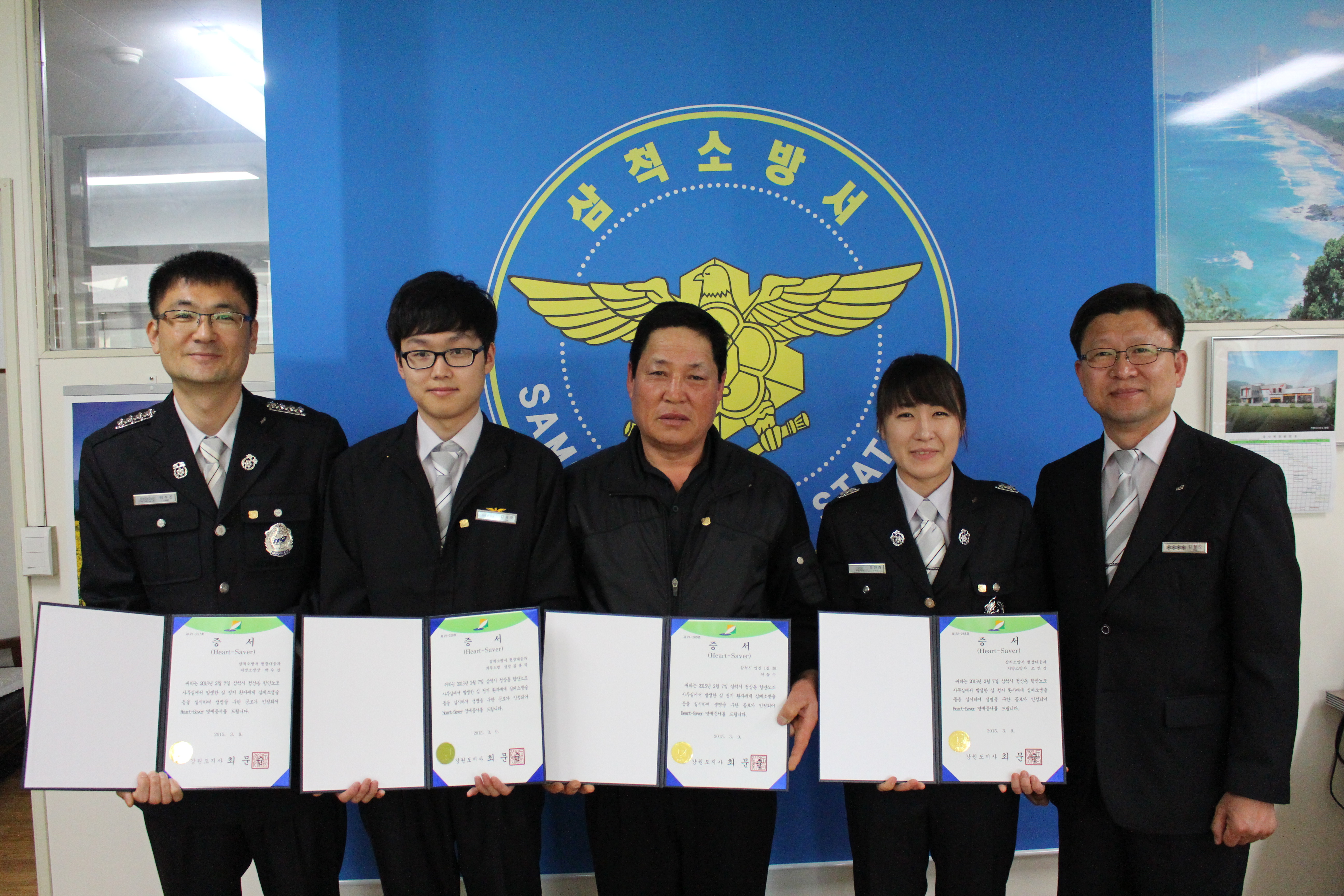 △삼척소방서(서장 김형도)는 서장실에서 신속한 응급처치로 심정지 환자(남,72세)를 소생시킨 소방장 박수진, 소방사 조연경, 의무소방원 김용국, 천동호(남/50세, 동남호 선장) 4명에게 하트세이버 증서와 배지를 수여했다.