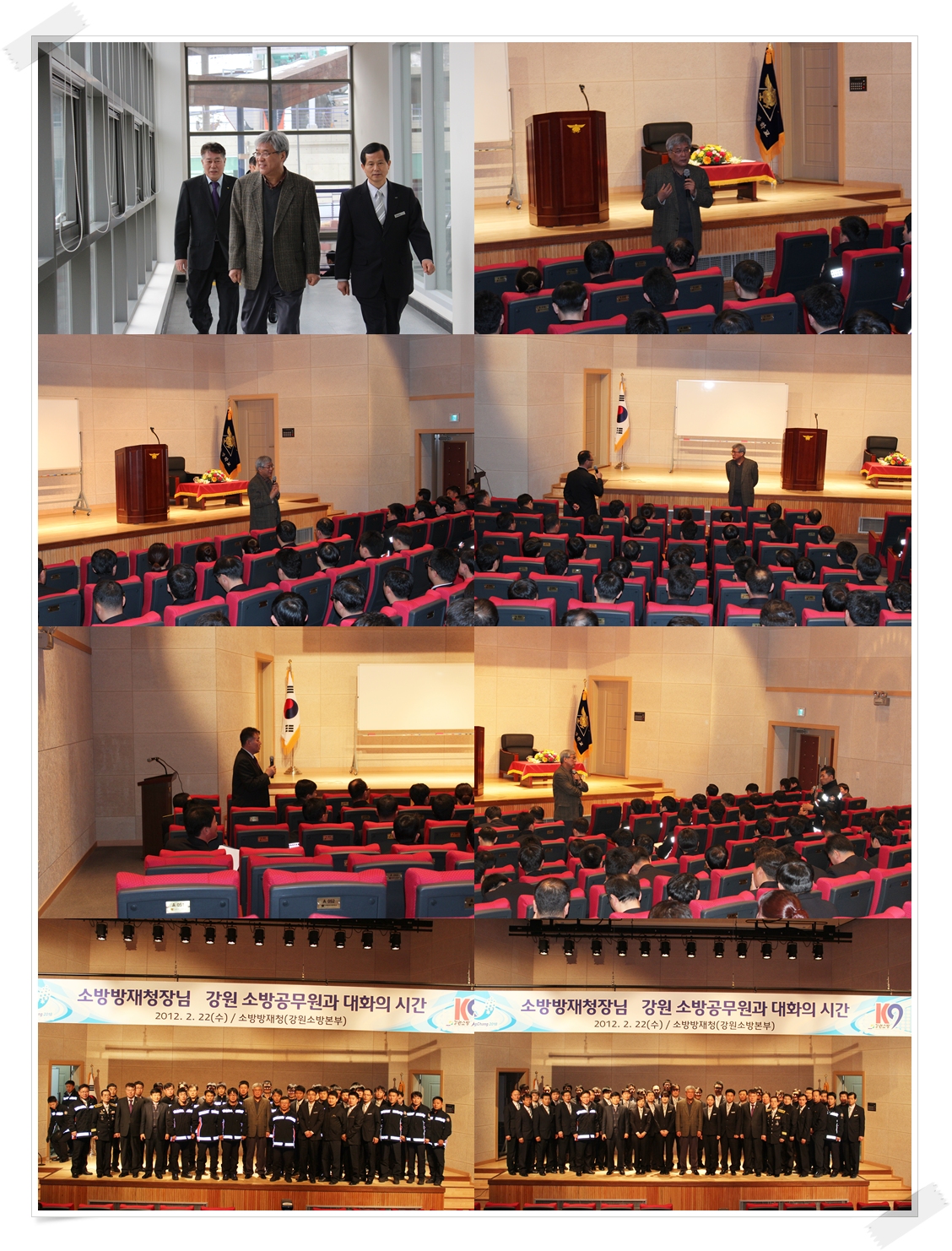 2012. 2.22(수) 강원도소방학교(학교장 이갑규) 대강당에서 학교 교직원외 인근 6개 소방관서 직원 110여명과 청장님과의 대화의 시간을 운영하였다. 대화의 시간에 앞서 『현장중심의 소방정책 추진 및 미래지향적 조직 설계 방안』에 대한 청장님을 말씀에 이어, 직원들의 의견, 건의사항을 청취하시고 현안 사항에 대해 질의답변하는 시간을 가졌다.