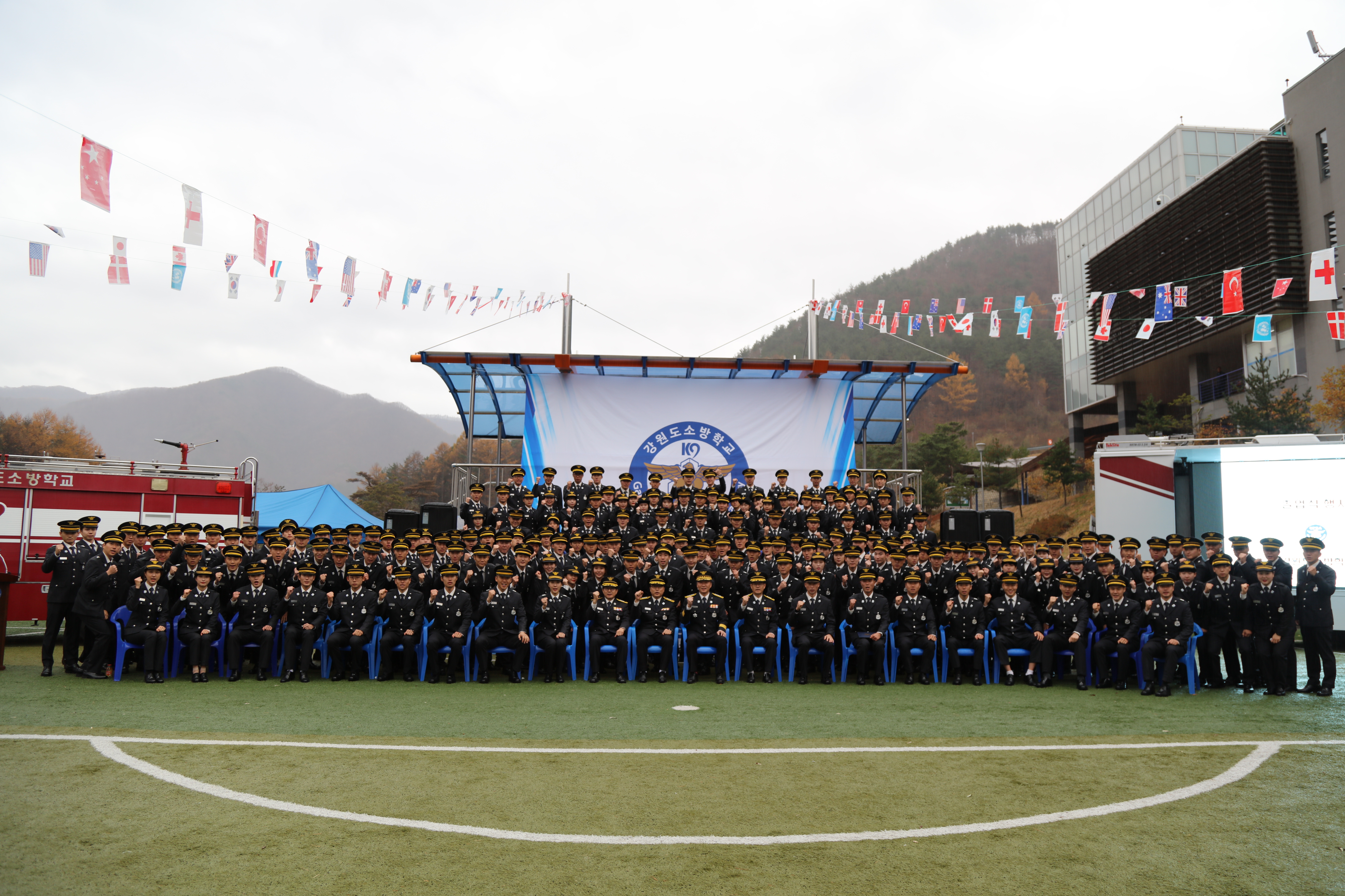 신임 소방사 186명과 가족들, 강원도소방학교장, 태백소방서장, 동해소방서장과 이하 소방학교 교직원들이 모인 가운데 성대하게 치러졌습니다.