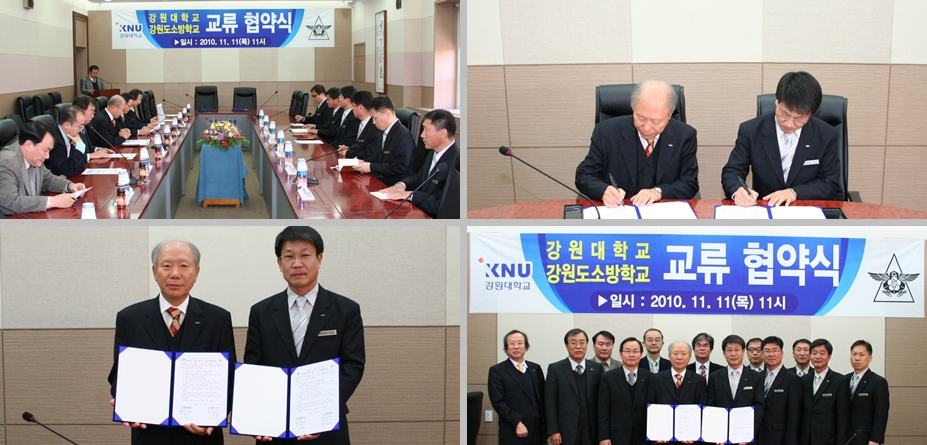 강원도소방학교(학교장 이흥교)와 강원대학교(부총장 최선도)는 11일 11:00에강원대학교 삼척캠퍼스 대학 본관에서 양 기관 관계자 14명이 참가한 가운데 교육기관 간 학술.기술.연구분야 상호협력을 위하여 협약(MOU)을 체결하였다.