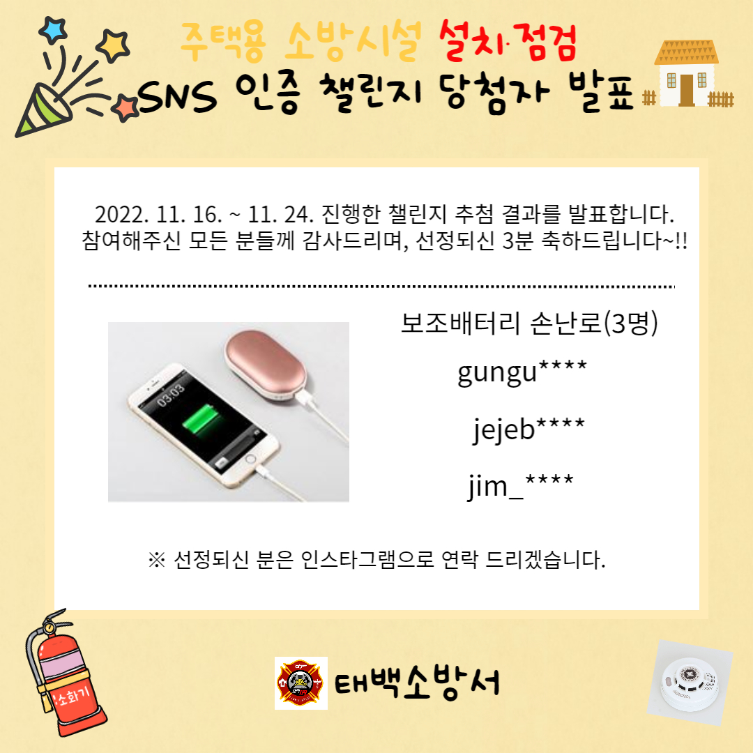 불조심 강조의 달 주택용 소방시설 설치 및 점검 SNS 인증 챌린지 당첨자 발표