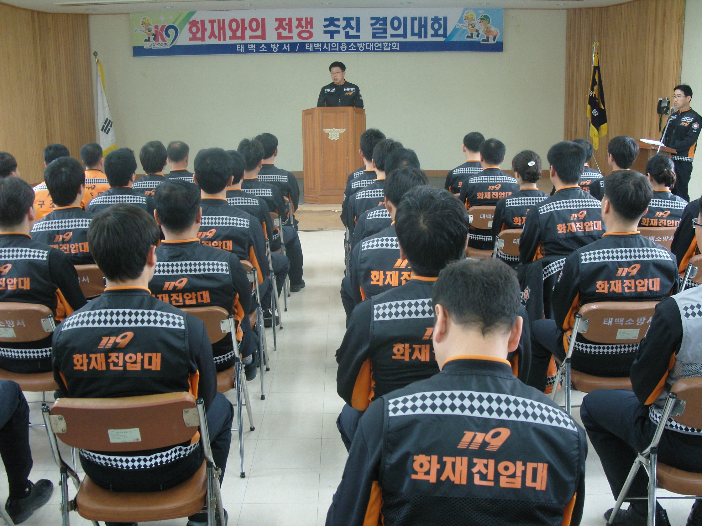 태백소방서(서장 정승진)는 4월 19일(월) 09:00 태백소방서 대회의실에서 전직원이 모인 가운데 『화재와의 전쟁 추진 결의대회』를 갖고 화재로 인한 피해 줄이기에 만전을 기할 것을 다짐했다.