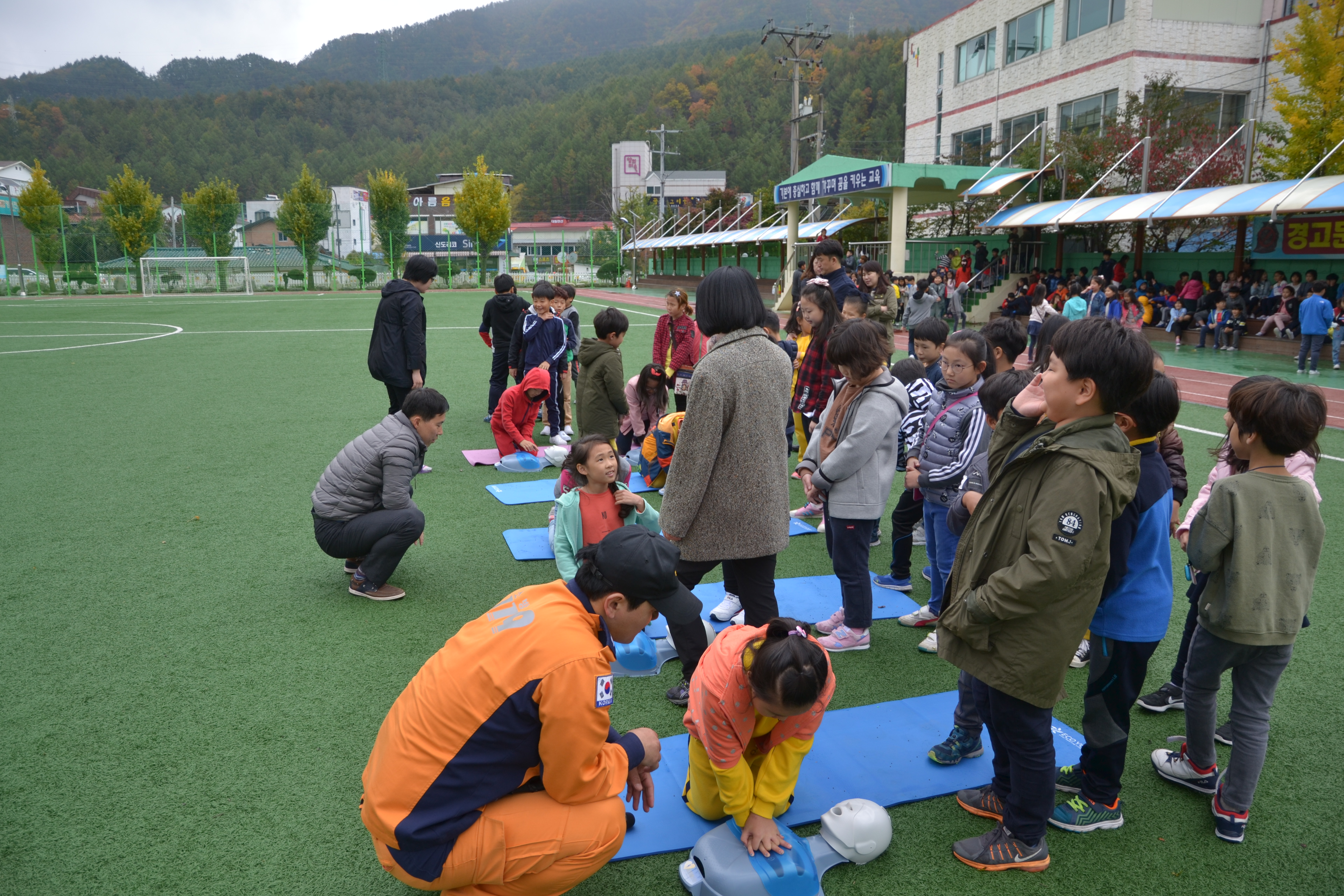 이날 훈련은 ▲ 지진경보 발령 ▲ 학생과 주민 운동장 대피 ▲ 운동장에서 다목적체육관 이동 ▲ 실습·체험교육 ▲ 훈련 종료의 순서로 진행되었다.