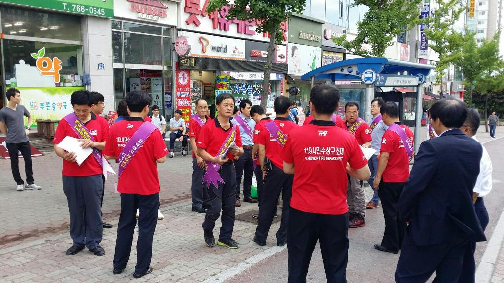 원주의용소방대(대장 조성일)는 7월4일 14:00시 부터 원주 시네마앞 광장에서 여름철 물놀이 안전 켐페인을 대원24명이 참가하여 실시했습니다