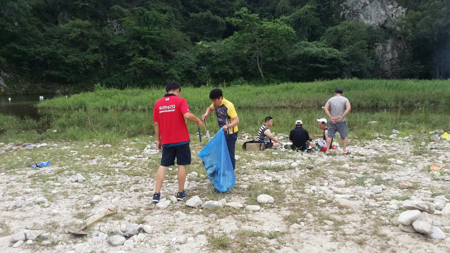 원주남성의용소방대 조성일대장외(42명)은 8월17일 정기교육 및 여름철 물놀이 안전근무 해단식과 함께 칠봉유원지에서 환경정화활동을 하였습니다.