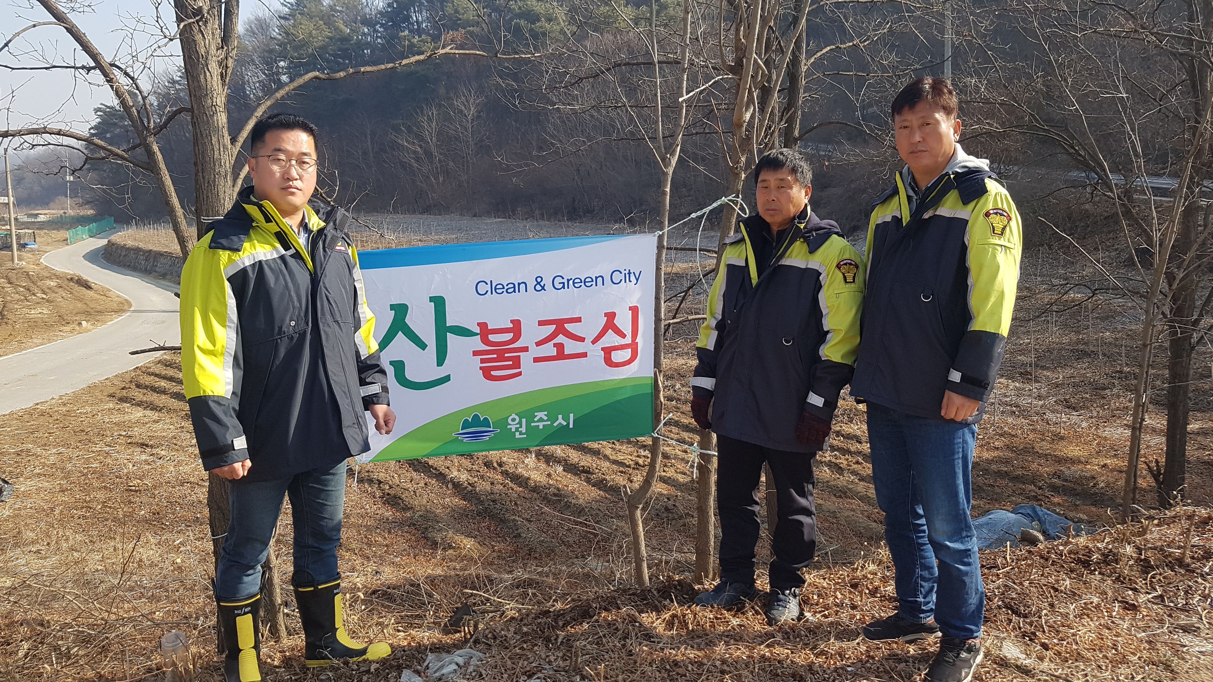 흥업남성의용소방대" 대안3리 농작물 소각활동 및 현수막 설치"