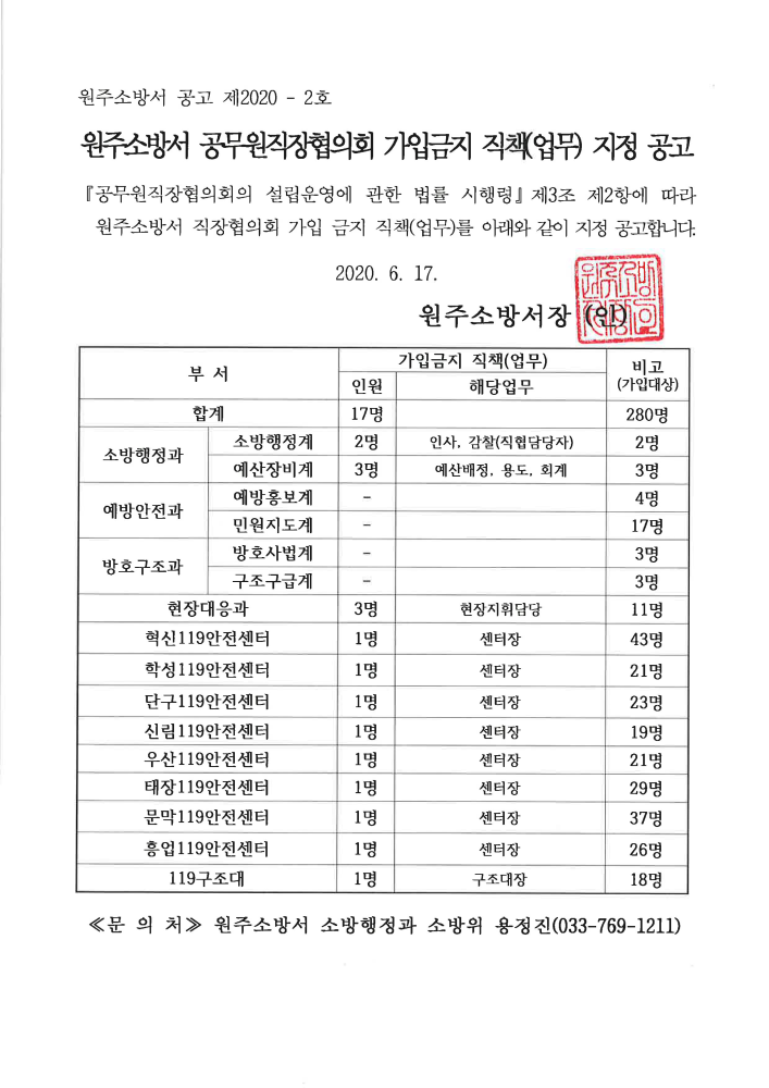 원주소방서 공무원직장협의회 가입금지 직책(업무) 지정 공고