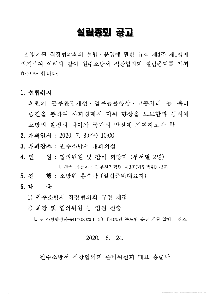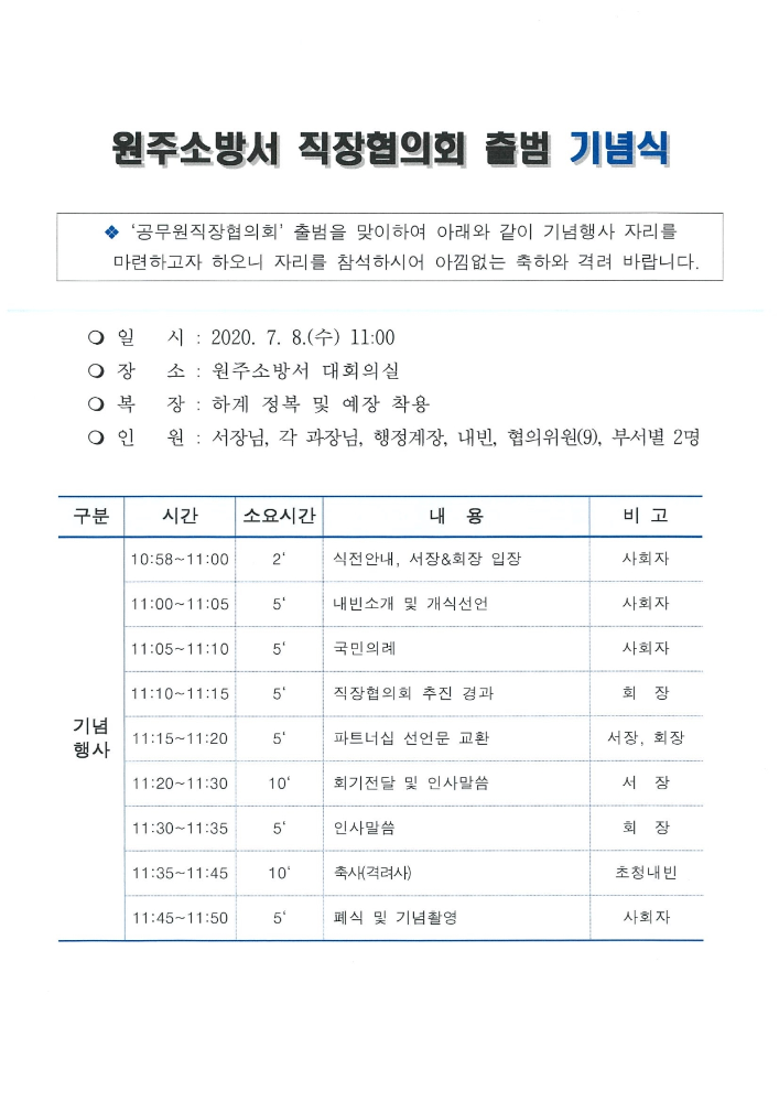원주소방서 직장협의회 설립총회 및 기념식