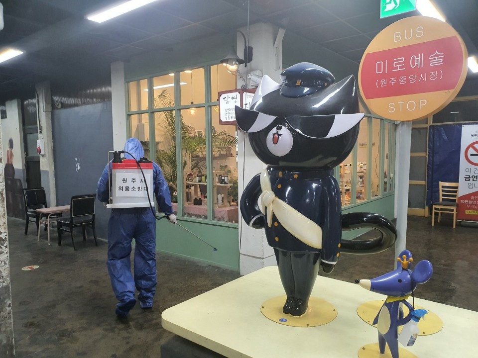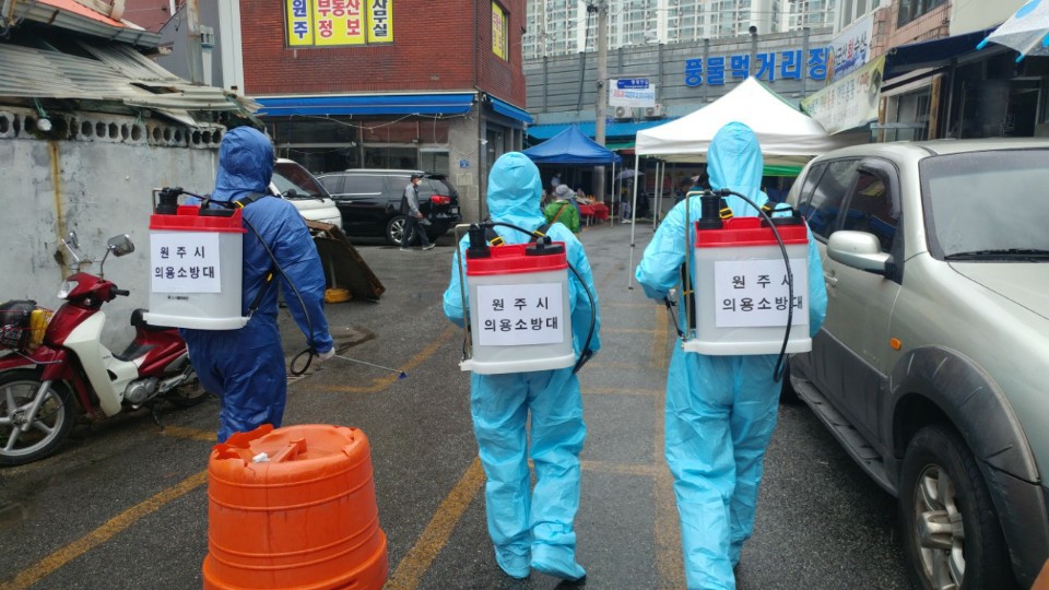 원주보건소로부터 방역물품을 지원받아 원주 남성의용소방 이동원 대장을 비롯한 18명은 원주역사 및 전통시장 일대에서 11일부터 16일 까지 6일간 방역활동을 실시했습니다.