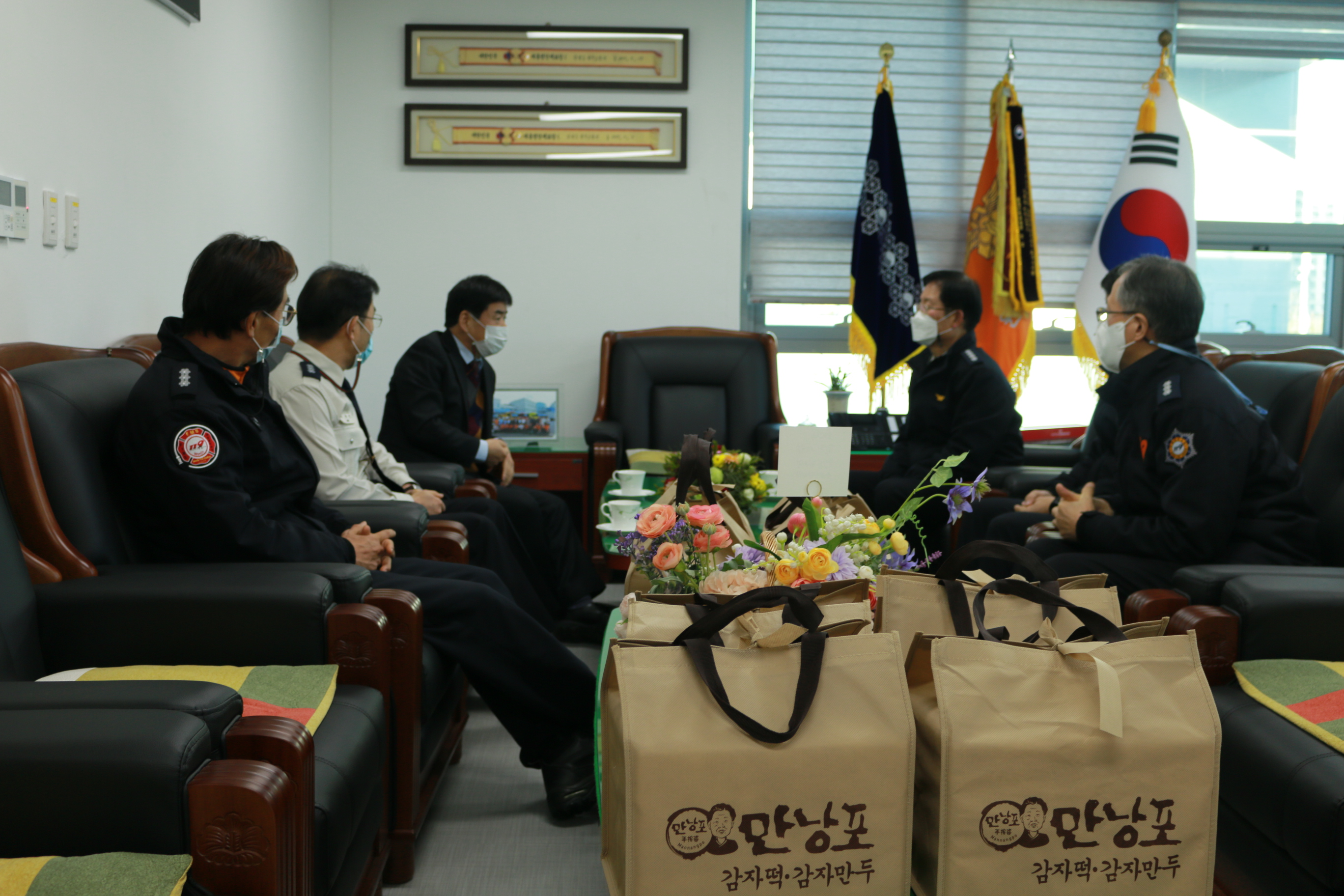 원주소방서(서장 이기중)는 6일 오후 14시 김광수 원주부시장이 소방서를 방문해 최근 증가하는 코로나 확진자 이송 과업을 수행하고 있는 구급대원을 격려했다고 밝혔다.