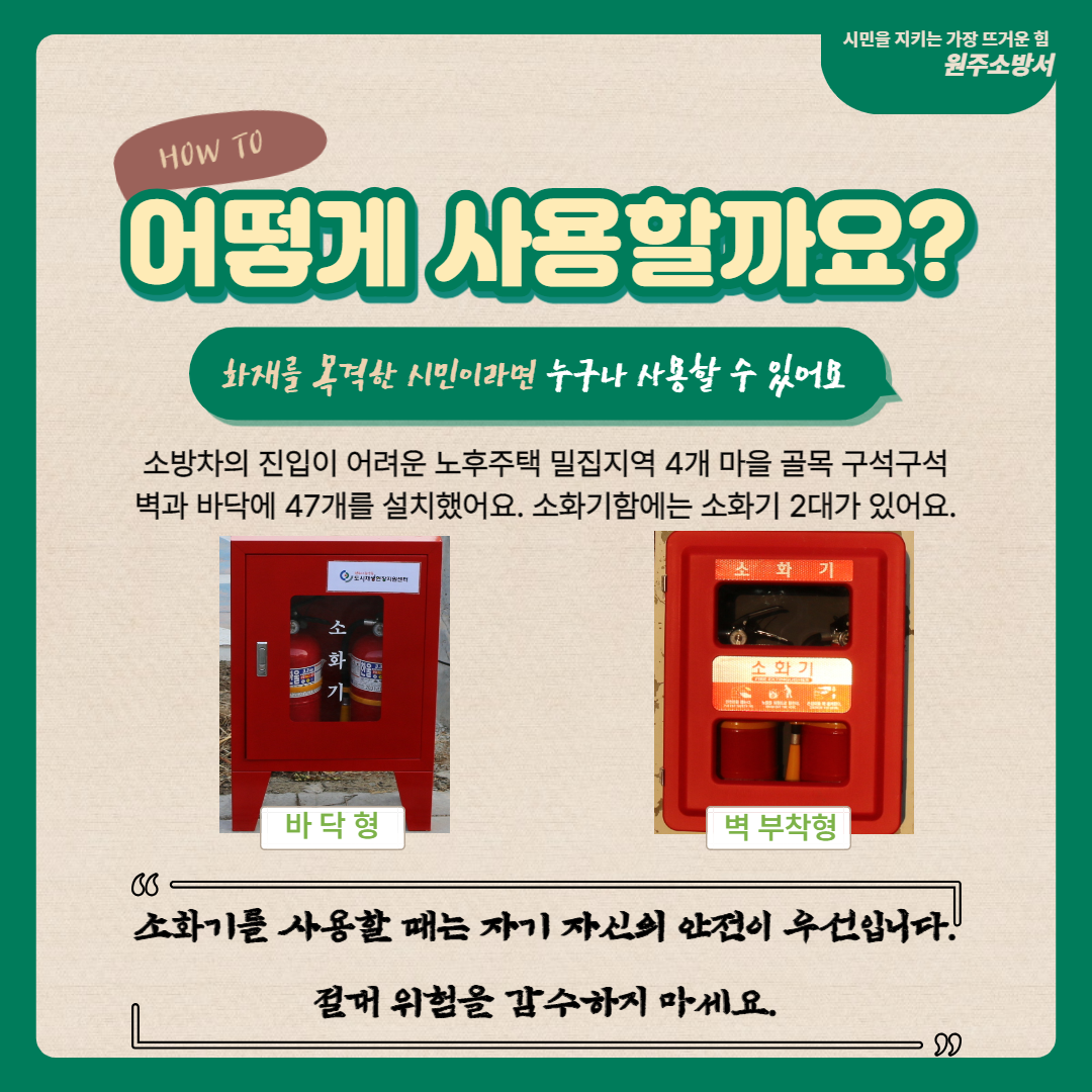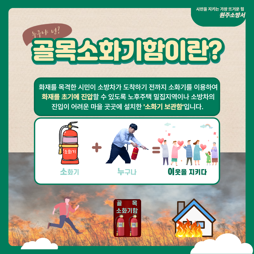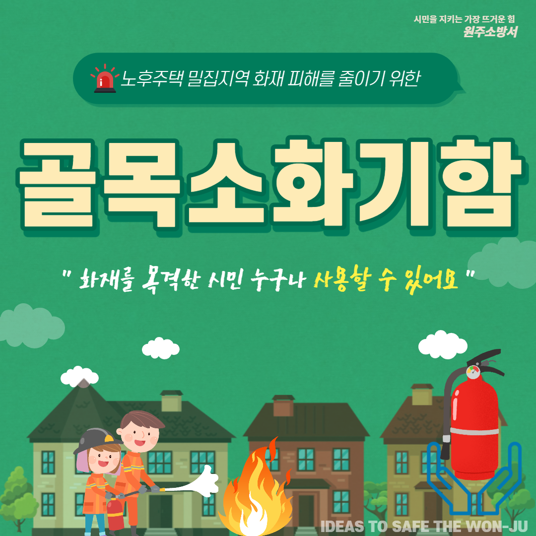 따라서 골목 곳곳에 시민 누구나 사용할 수 있는 공용 소화기를 설치하여 초기에 진화할 수 있는
