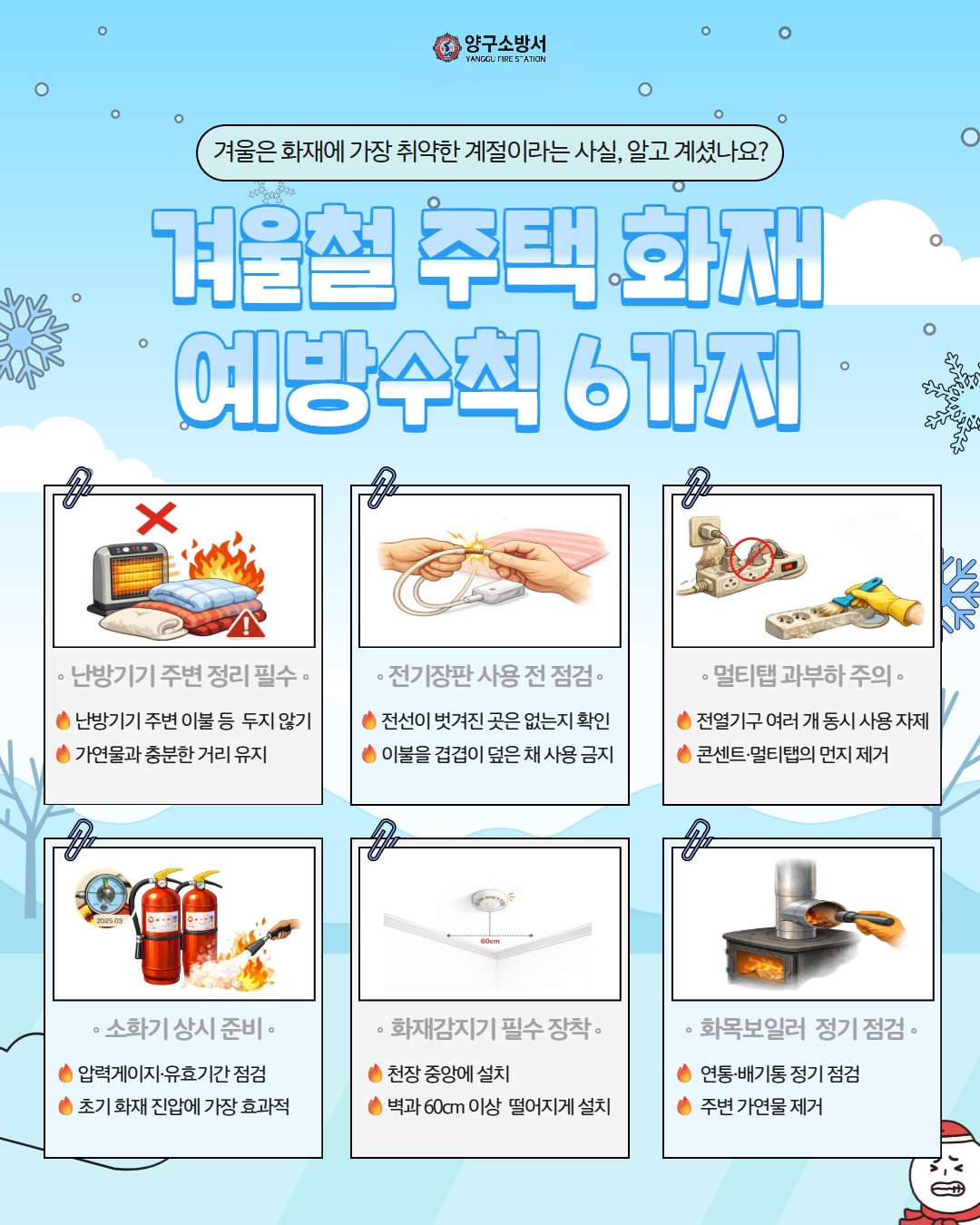 | 427 | 겨울철 주택 화재 예방수칙 6가지 꼭 지켜주세요 | 양구 | 2025-12-30 | 81 | |