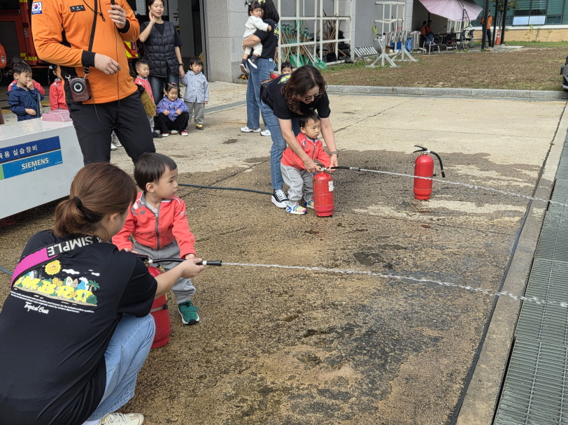 아이들은 소방차 탑승 체험, 소화기 사용법 교육 및 물 소화기 체험,