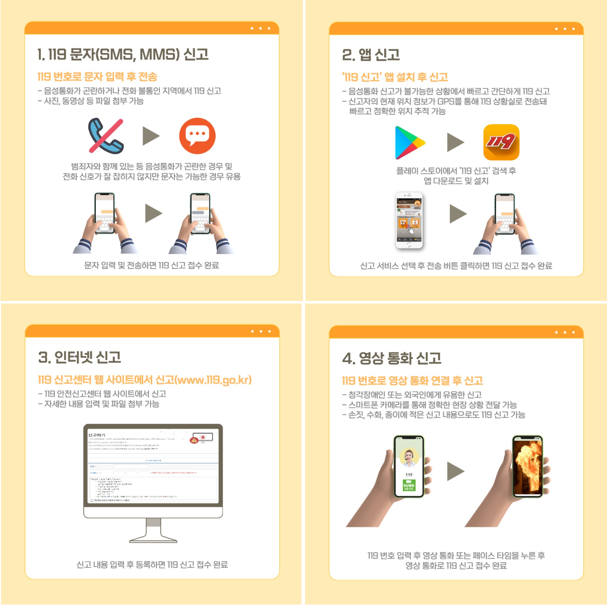 하지만 이제는 119 다매체 신고 서비스로 음성통화 외에 문자, 앱, 인터넷, 영상통화로도 119에 신고 할 수 있습니다!