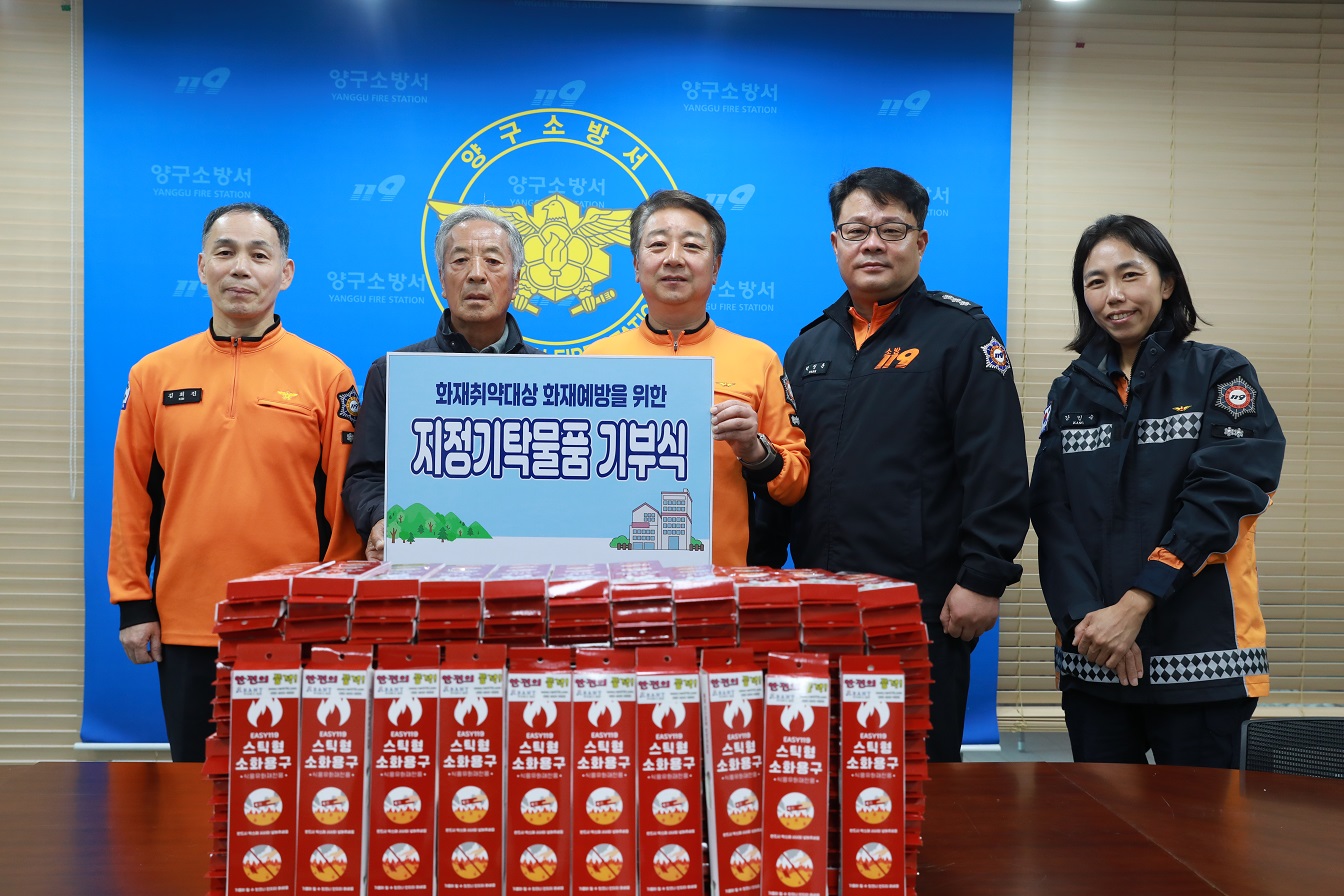 ◇양구소방서(서장:용석진)는 14일 소방서 소회의실에서 열린 지정 기탁 물품 기부식을 통해 이덕래 양구군 시민안전관리협의회 부회장으로부터 겨울철 화재 예방을 위한 100만원 상당의 ‘주방 화재용 스틱형 소화용구’ 200여개를 기탁받았다.