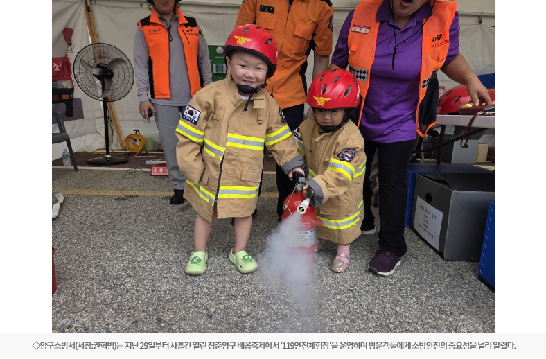 【양구】양구소방서는 지난 29일부터 사흘간 열린 청춘양구 배꼽축제에서 '119안전체험장'을 운영하며 방문객들에게 소방안전의 중요성을 널리 알렸다.