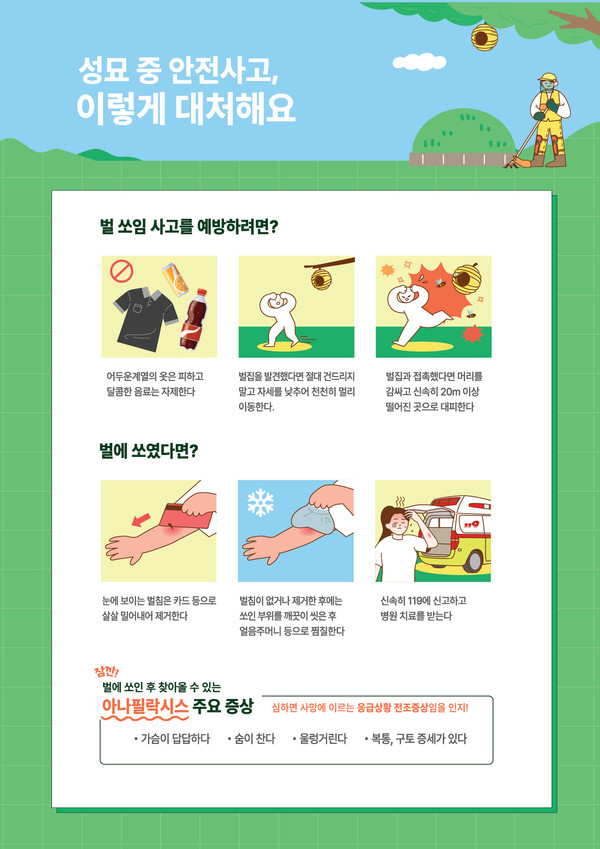 벌 쏘임 사고를 예방하려면 어두운 옷이나 달콤한 음료를 피하고, 벌에 접촉 시에는 머리를 감싸고 최소 20m 이상 대피해야 한다. 쏘였다면 벌침 제거 후 얼음찜질을 하고 병원에서 진료를 받아야 하며, 호흡곤란이나 구토 등 아나필락시스 증상이 나타나면 즉시 119에 신고해야 한다.