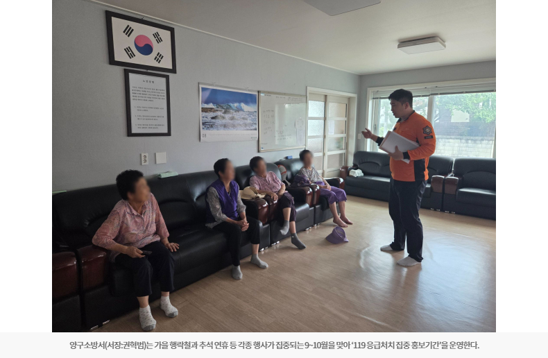 【양구】양구소방서는 가을 행락철과 추석 연휴 등 각종 행사가 집중되는 9~10월을 맞아 ‘119 응급처치 집중 홍보기간’을 운영한다.