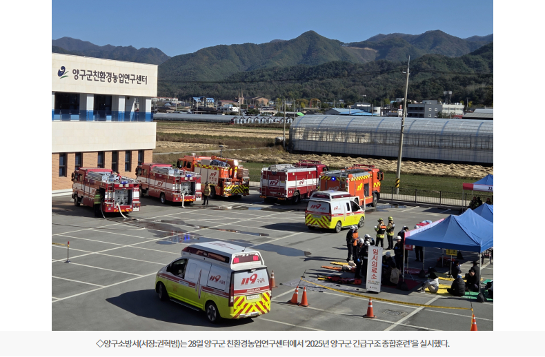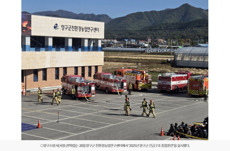 【양구】양구소방서는 28일 양구군 친환경농업연구센터에서 ‘2025년 양구군 긴급구조 종합훈련’을 실시했다.