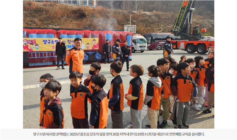 【양구】양구소방서(서장:권혁범)는 2025년 불조심 강조의 달을 맞아 26일 지역 내 한국119청소년단을 대상으로 안전체험 교육을 실시했다.