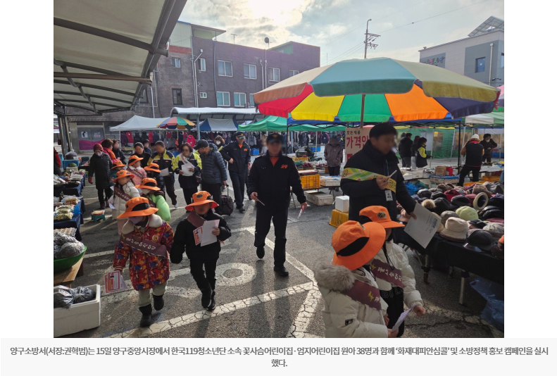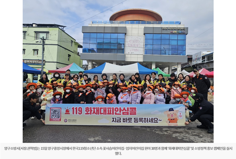 【양구】양구소방서는 15일 양구중앙시장에서 한국119청소년단 소속 꽃사슴어린이집·엄지어린이집 원아 38명과 함께 ‘화재대피안심콜’ 및 소방정책 홍보 캠페인을 실시했다.