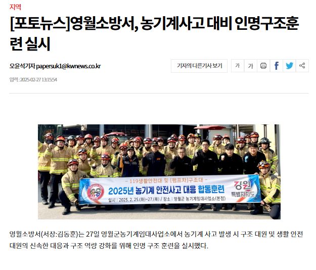 영월소방서(서장:김동훈)는 27일 영월군농기계임대사업소에서 농기계 사고 발생 시 구조 대원 및 생활 안전 대원의 신속한 대응과 구조 역량 강화를 위해 인명 구조 훈련을 실시했다.