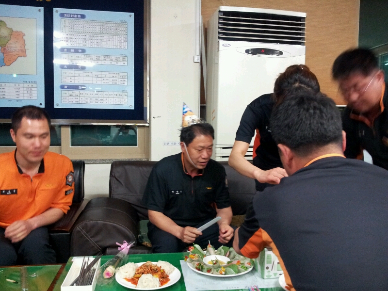 현장지휘대 및 구조대 직원과 함께 맛나게 먹으며 즐거운 생신파티를 하였습니다,