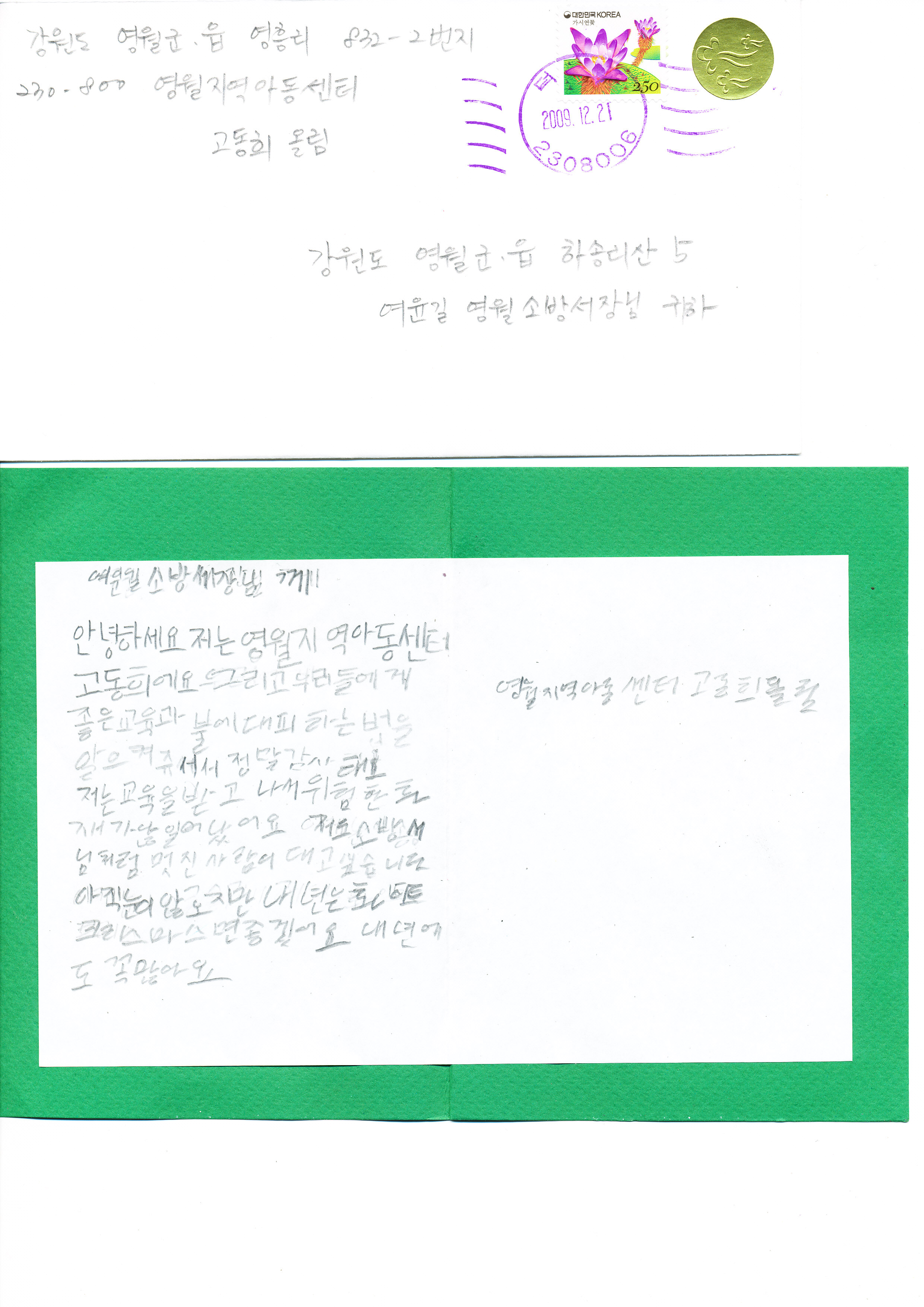 영월지역아동센터 어린이가 서장님께 보내는 크리스마스카드입니다. 메리크리스마스~~