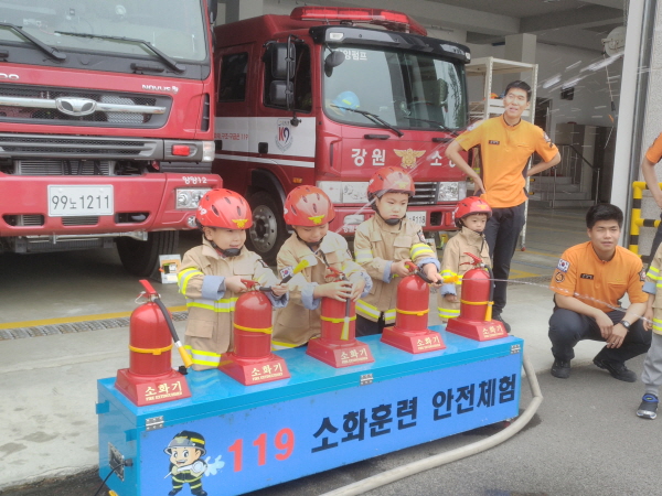 이날 교육은 소화기 사용법, 연기대피체험, 소방차량ㆍ소방서 견학 등으로 재난에 취약한 어린이들의 눈높이를 고려해 안전에 대해 관심을 갖고 체험할 수 있도록 진행됐다.